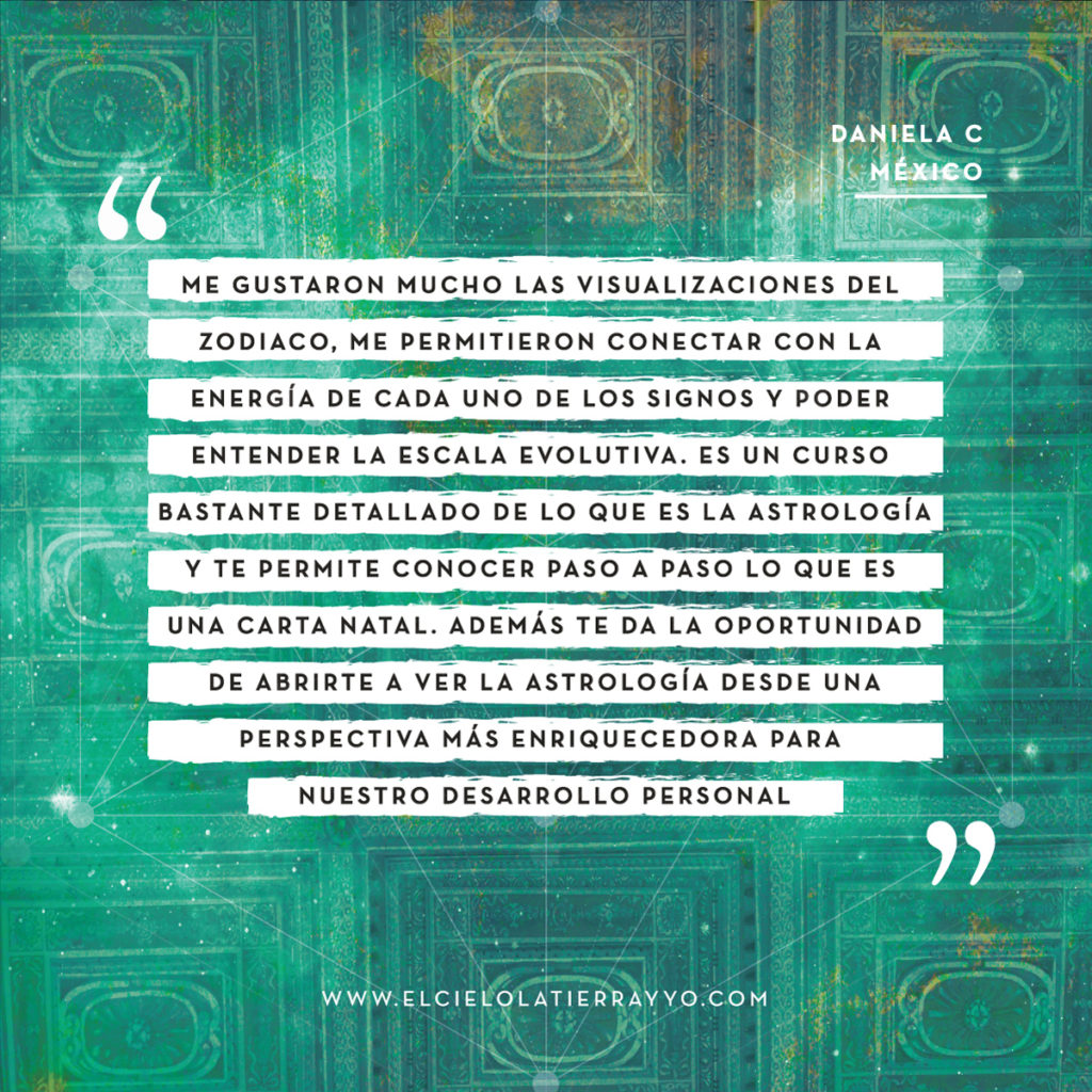 "Me gustaron mucho las visualizaciones del zodiaco, me permitieron conectar con la energía de cada uno de los signos y poder entender la escala evolutiva. Es un curso bastante detallado de lo que es la Astrología y te permite conocer paso a paso lo qué es una carta natal. Además de ser un Curso de Iniciación, te da la oportunidad de abrirte a ver la Astrología desde una perspectiva más enriquecedora para nuestro desarrollo personal.